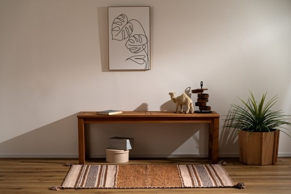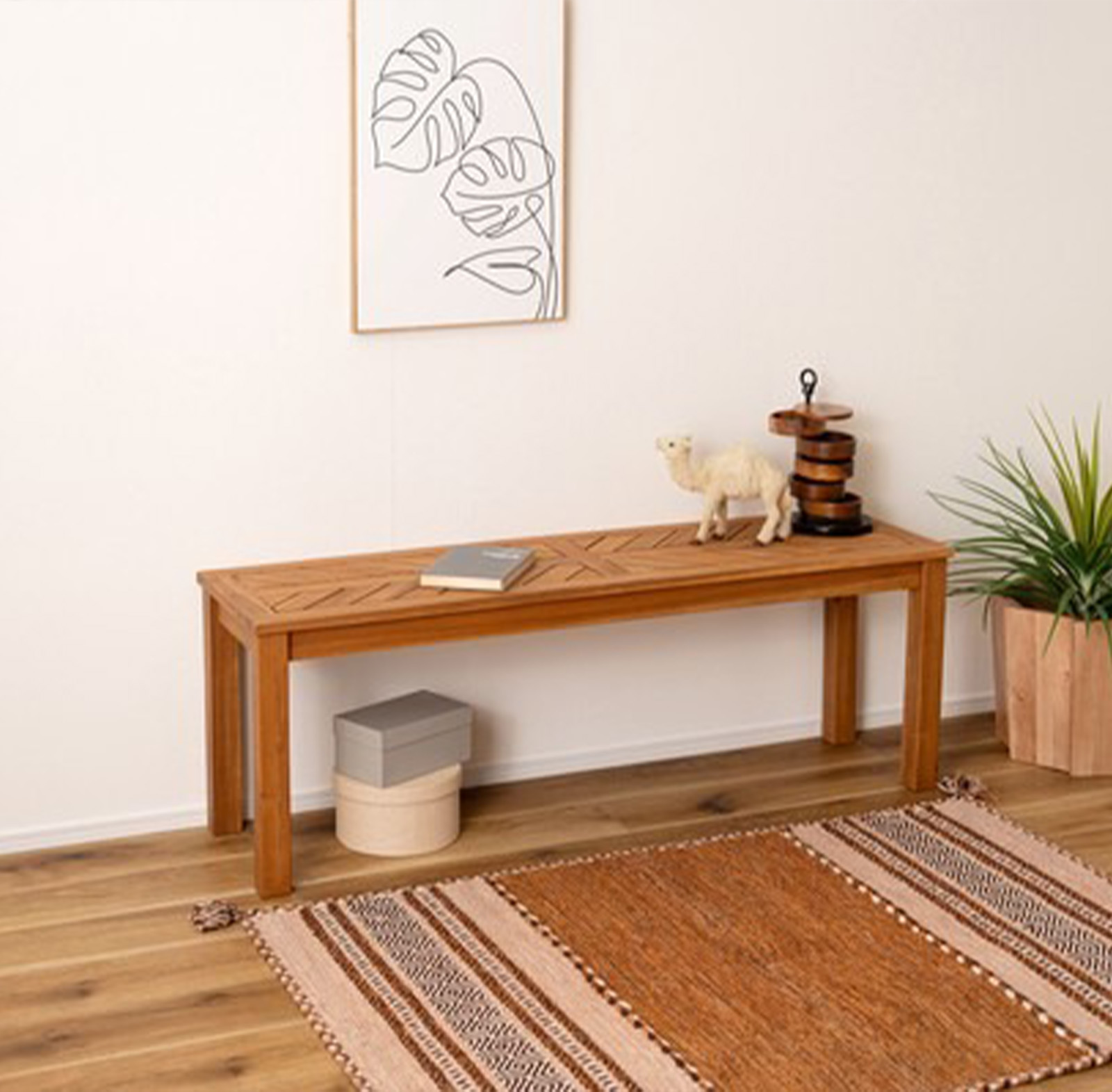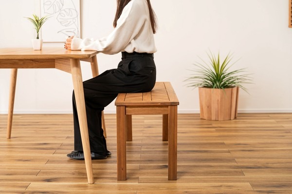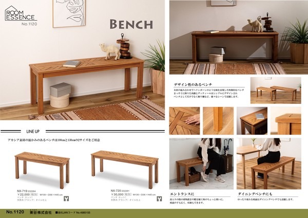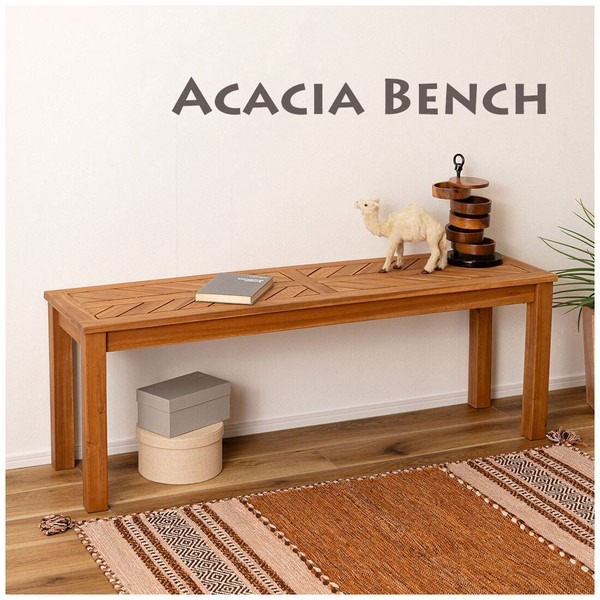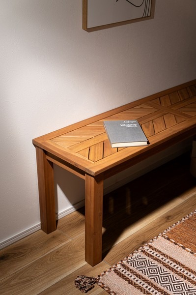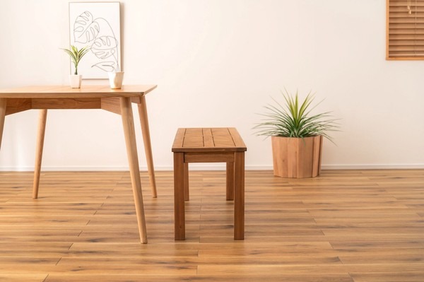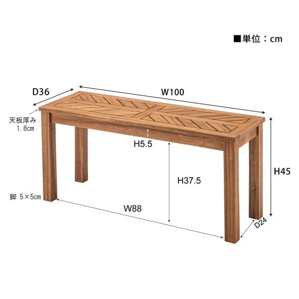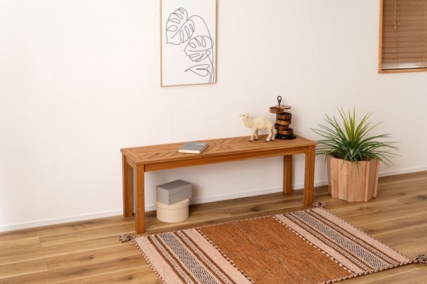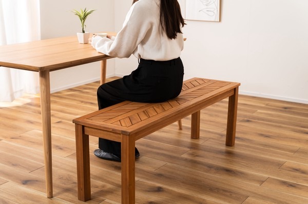 ●木材の組み合わせでヘリンボーンのような柄を表現した特徴的なベンチ。 ●シンプルデザインの角脚で、ベンチとしてだけでなく飾り棚など、様々なシーンで活躍。 ●座面は、木材を組み合わせて作られたヘリンボーンのような柄が目を引きます。 ●ゆったりと座れるサイズ感は、ダイニングベンチとして最適。 ●エントランスの出入りの際の荷物置きや、靴を履く時のちょっと使いに。 ●座面下も広く、収納ケースやボックス等を置くことも可能。 ●デザイン性のあるベンチなので、飾り棚として置いておくだけでもサマになります。