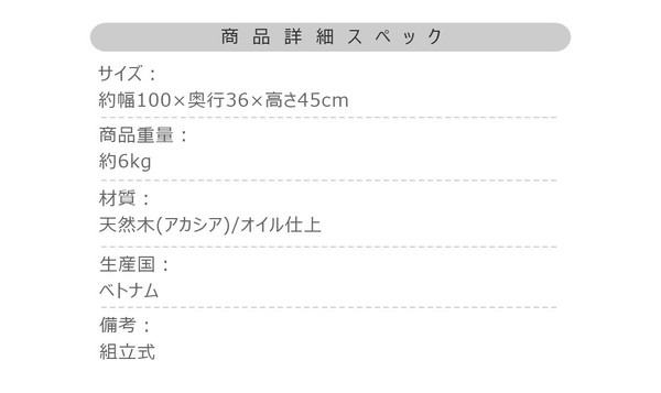 【規格】 ■生産地:ベトナム ■素材・成分: 材質:天然木(アカシア) オイル仕上 静的耐荷重:80kg 組立・完成:組立式