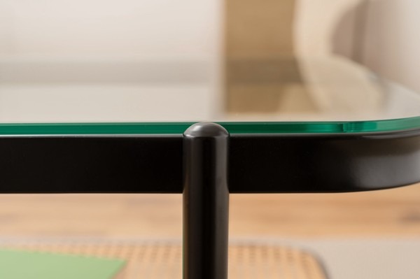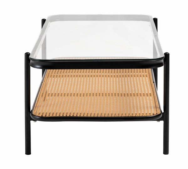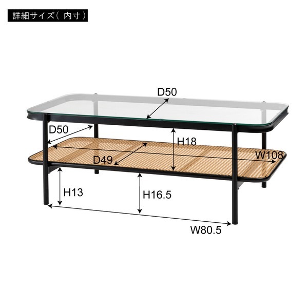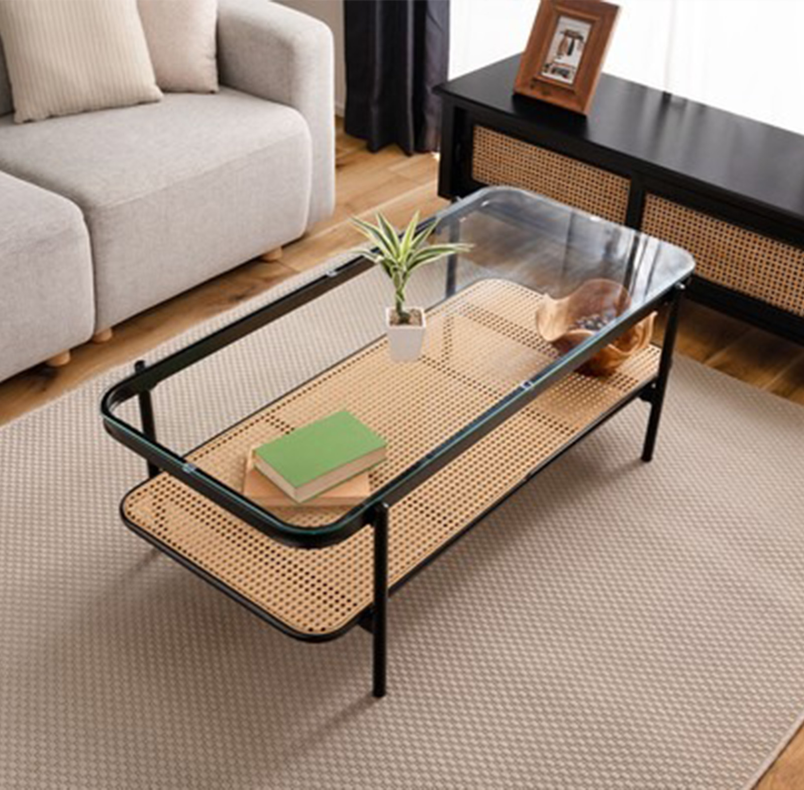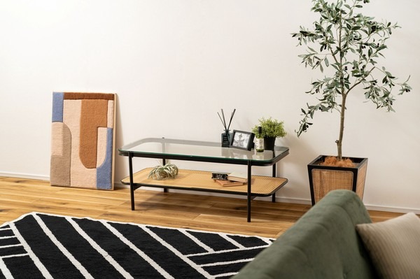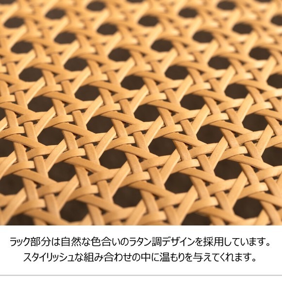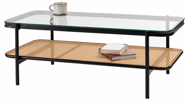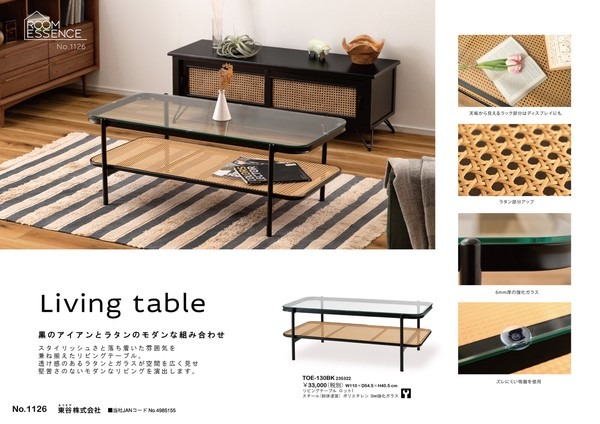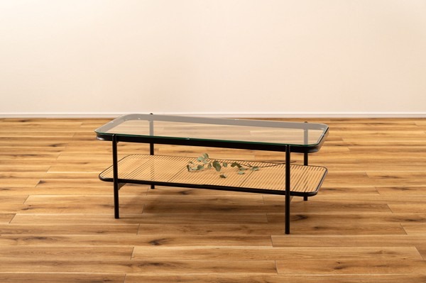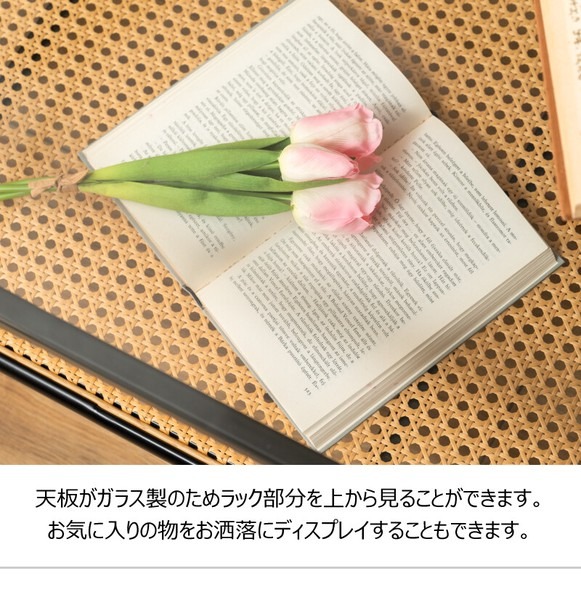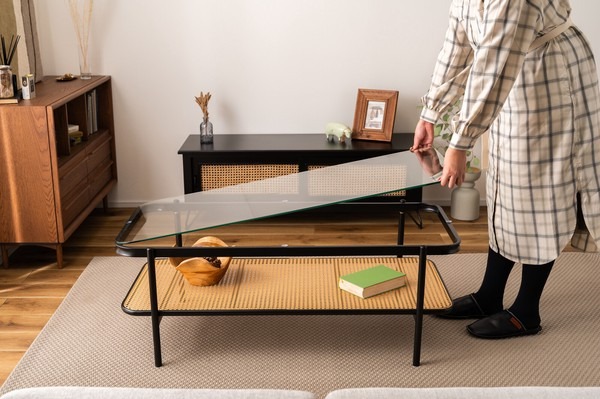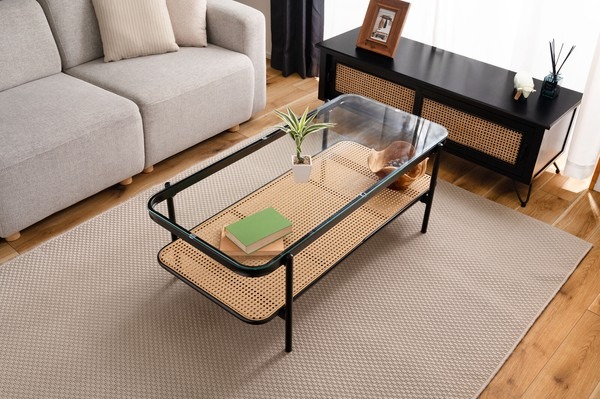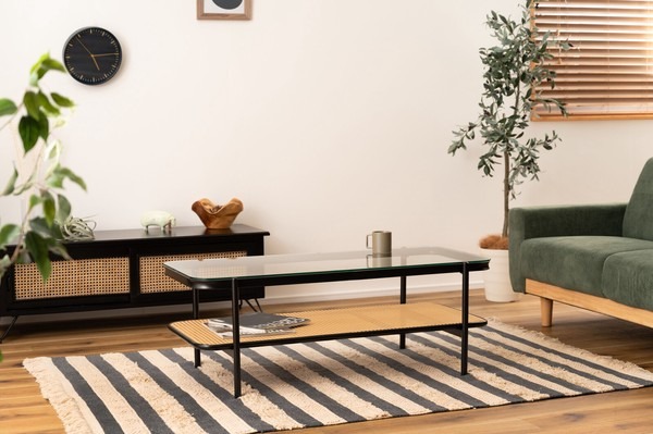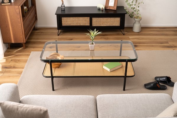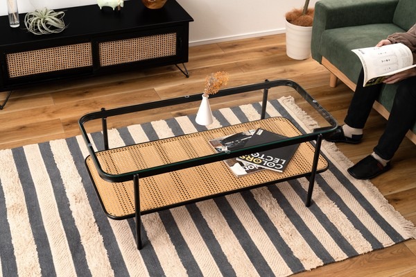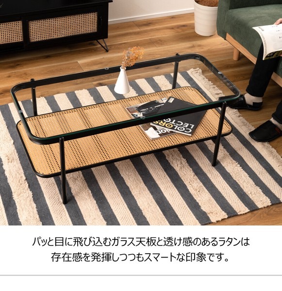 ・黒のアイアンとラタンのモダンな組み合わせ スタイリッシュさと落ち着いた雰囲気を兼ね備えたリビングテーブル。 ・透け感のあるラタンとガラスが空間を広く見せ堅苦さのないモダンなリビングを演出します。 ・天板から見えるラック部分はディスプレイにも ・6mm厚の強化ガラス ・ズレにくい吸盤を使用
