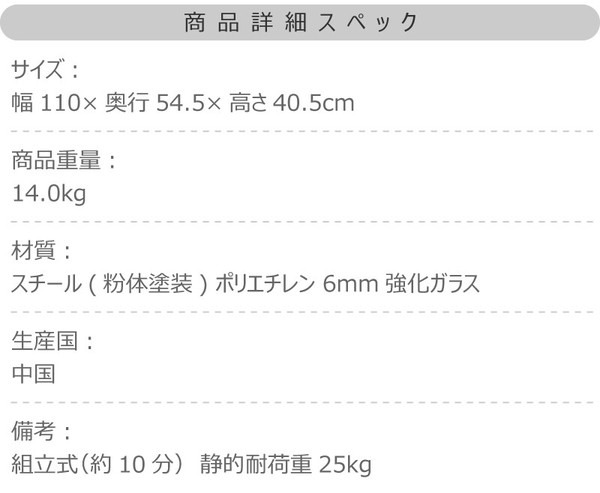 【規格】 ■生産地:中国 ■素材・成分: 材質:スチール(粉体塗装) ポリエチレン 6mm強化ガラス 静的耐荷重:25kg 組立・完成:完成品