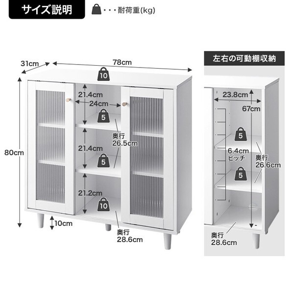 ●耐荷重約:天板:約10kg、中央収納棚:各約5kg、左右収納可動棚:各約5kg、底板:約10kg
