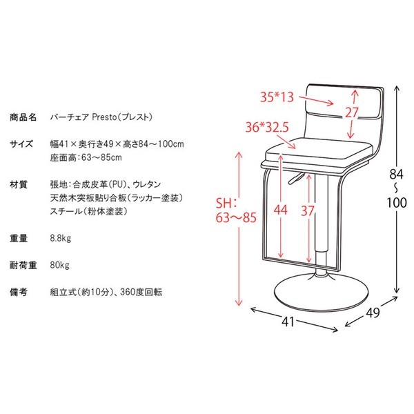 ●商品サイズ:約幅41×奥行き49×高さ84〜106cm、座面高さ63〜85cm