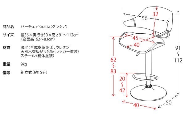 ●商品サイズ:幅56×奥行き50×高さ91〜112cm(座面高さ62~83cm)